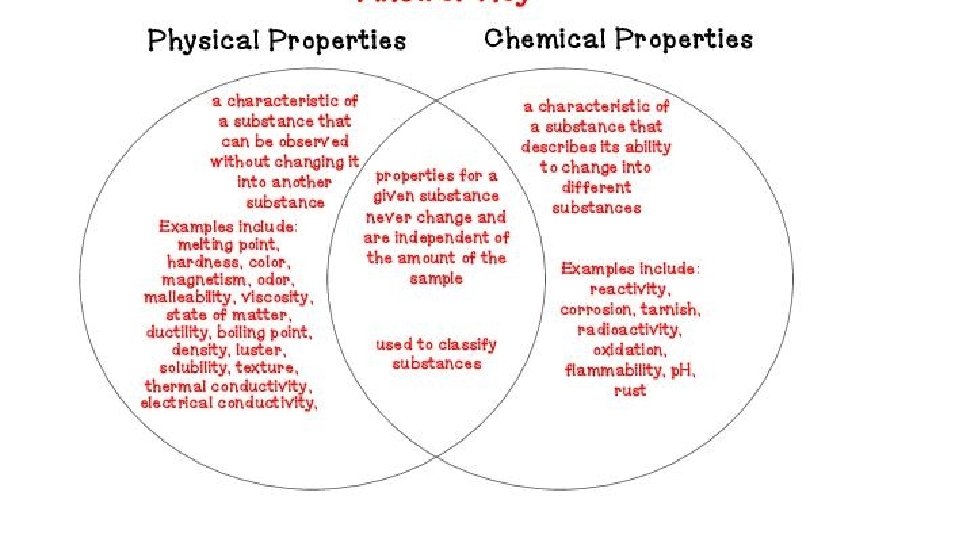 Properties of matter • Physical Property- characteristics of a material which can be observed without changing the identity of the substance in the material. ; examples include color, shape, size, melting point, and boiling point