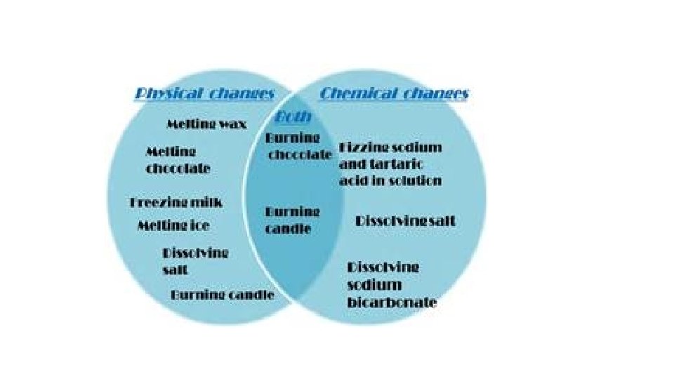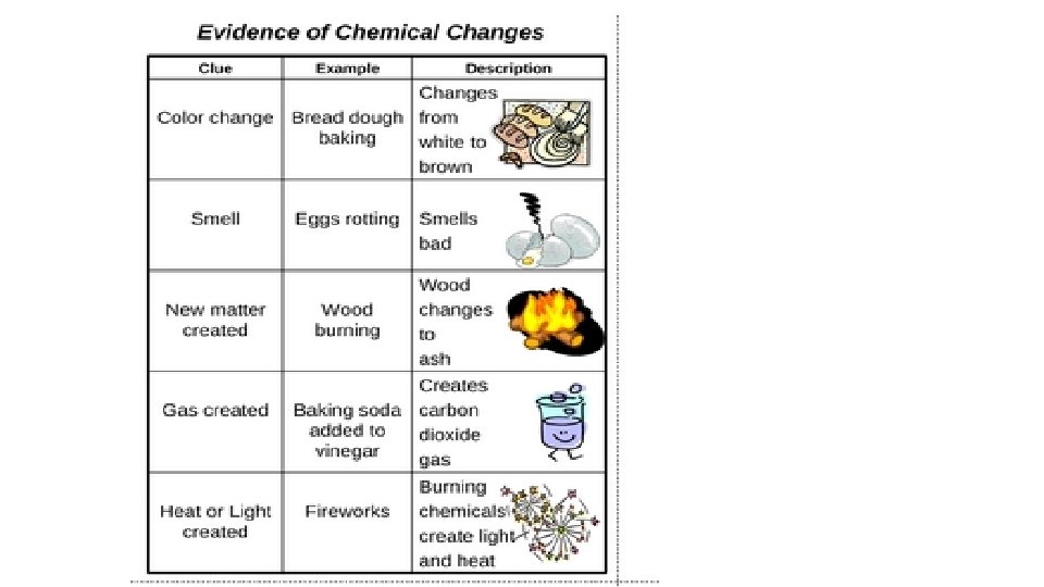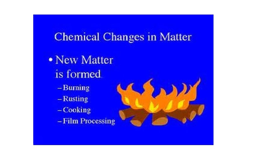 When one substance changes to another substance, a chemical change has occurred. • Some chemical changes are indicated by temperature change, smell, or bubble formation. • Other chemical changes occur very slowly such as the formation of rust. • Chemical changes can be used to separate substances such as metals from their ores. • THESE PROPERTIES of a substance NEVER CHANGE: density, specific heat, boiling point, melting point
