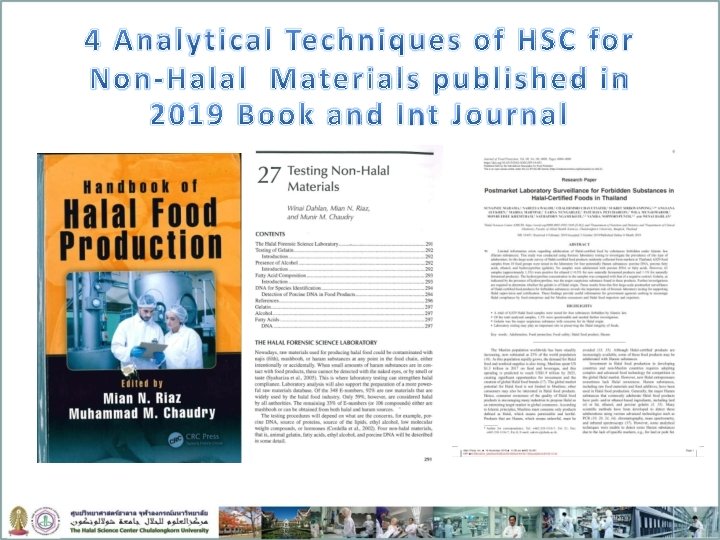 NOVEL HALAL COSMETIC PRODUCTS OF THE HALAL SCIENCE CENTER CU 2011 Halal Clay Cleansing Liquid with 8 kinds of natural clay for Islamic Cleansing of All Najis PCT/TH 2010/000004 2016 Halal Sun Screen with 0. 5 % of Habbatu Sawda seed oil and 1% kaolin natural clay National Award IP Application No. 1601005207 2017 Halal Antiacne cream with 1. 0 % (w/w) crude Habbatu Sawda seed extract IP Application No. 1701002508 2019 Halal Perilla Seed Hydrating Lip Balm (International Award) IP Application No. 1903000647