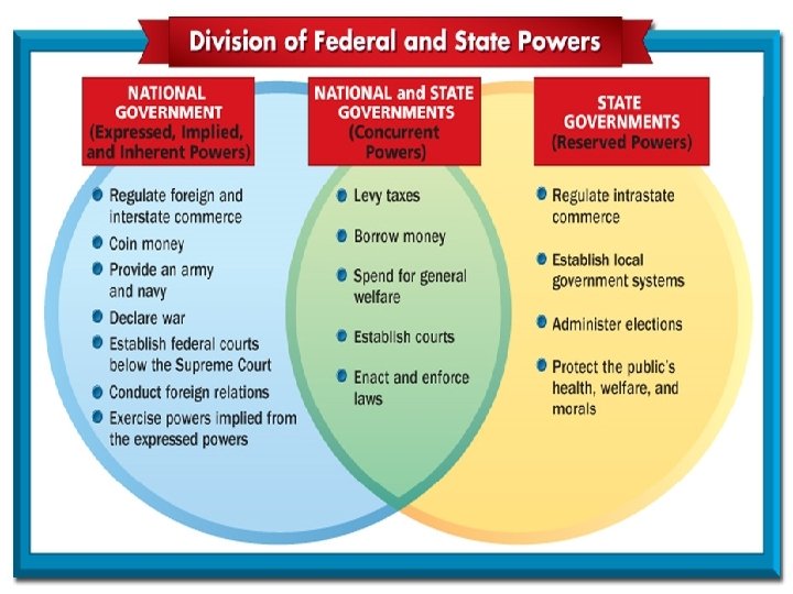 Division of Powers • Expressed Powers – granted to the United States government through the Constitution – Implied Powers (Necessary & Proper Clause) – Inherent Powers • Reserved Powers – granted to the state governments • Concurrent Powers- powers granted to the United States government and state