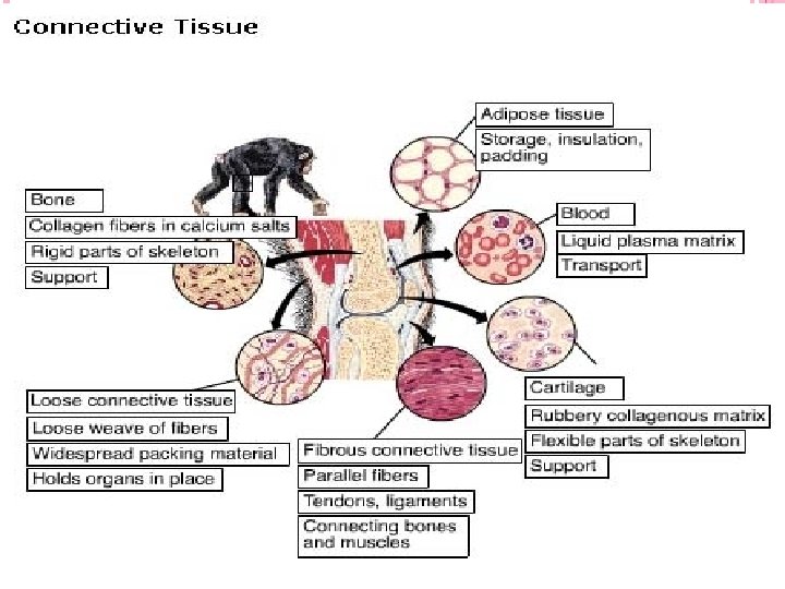 CONNECTIVE TISSUE (FRAMEWORK) Main function: binding and support other tissues Large amount of extracellular matrix with fewer cells Connective tissue cells secrete the extra-cellular matrix Extracellular matrix consists of network of fibers in liquid, jelly-like or solid matrix