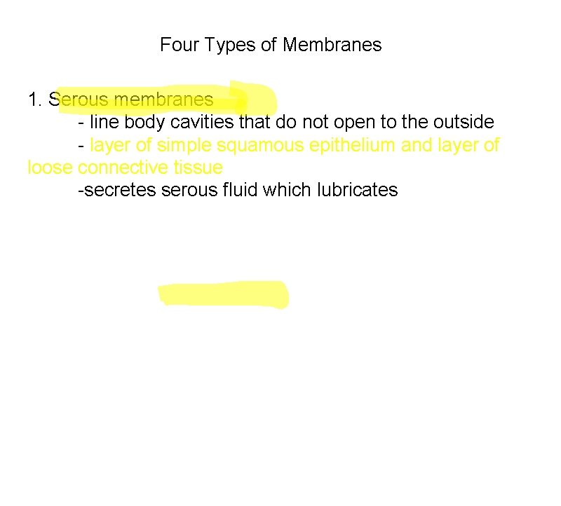 Four Types of Membranes 1. Serous membranes - line body cavities that do not open to the outside - layer of simple squamous epithelium and layer of loose connective tissue -secretes serous fluid which lubricates