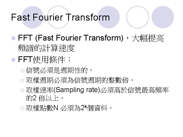 快速傅利葉轉換原理 l. A complex nth root of unity is a complex number z such that zn = 1. ¡ n = e 2 i / n = principal n th 3 root of unity. 4 = -1 i t ¡e = cos t + i sin t. ¡i 2 = -1. 5 ¡There are exactly n roots of unity: nk, k = 0, 1, . . . , n-1. 2 = i 1 0 = 1 7 6 = -i
