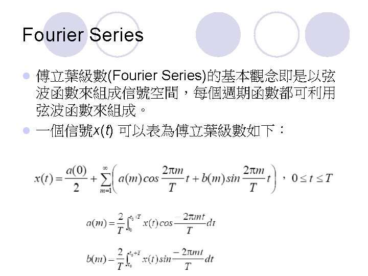 Fourier Series l 任一週期(periodic)函數可以分解成許多不同振幅 (amplitude),不同頻率(frequency)的 ¡ 正弦(sinusoidal)諧波(harmonic) 與 ¡ 餘弦(cosinusoidal)諧波(harmonic) 的合成(composition)