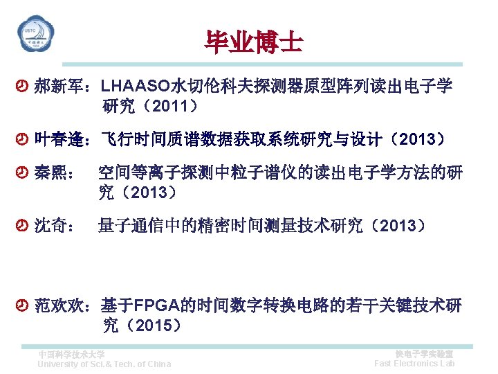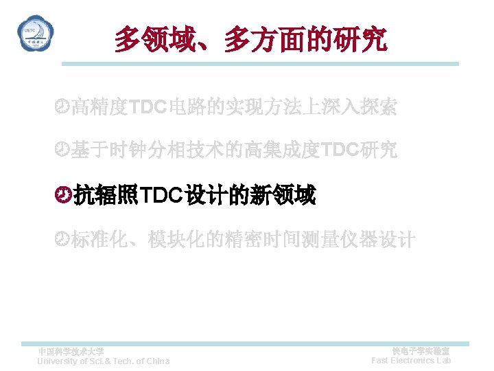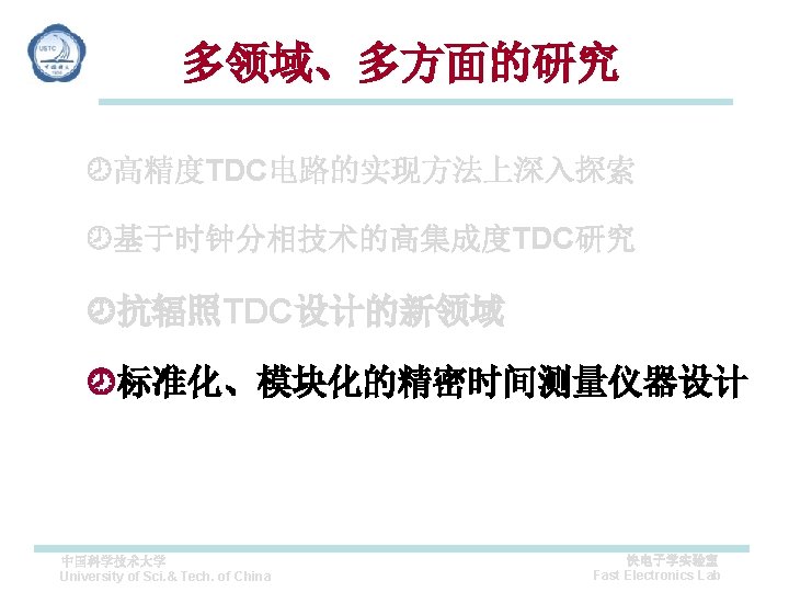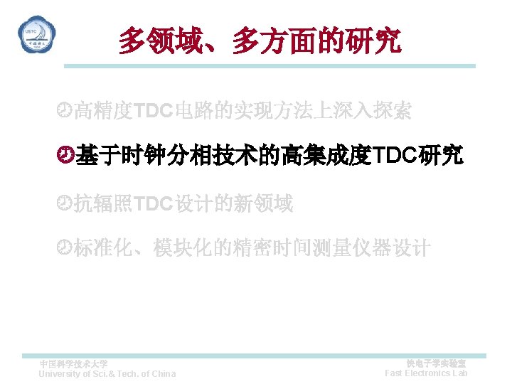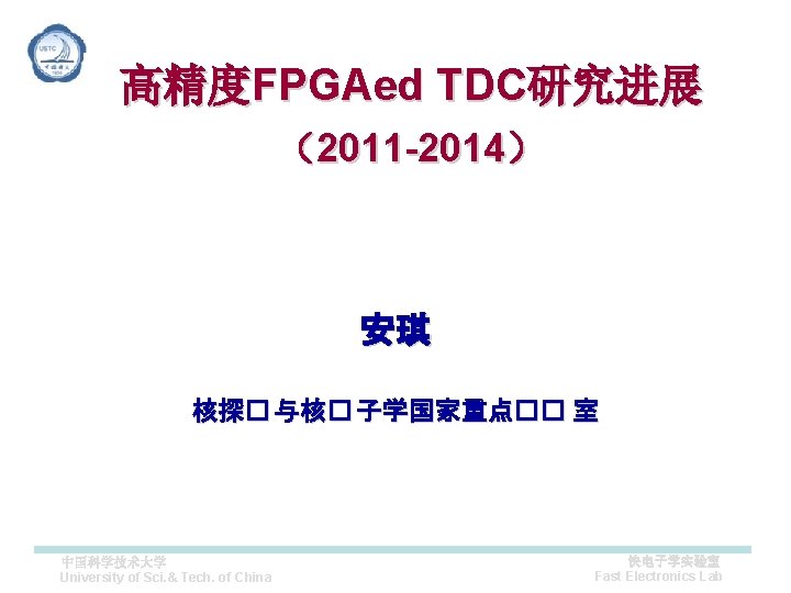 汇报内容 FPGAed TDC的研究进展 FPGAed TDC的应用 人才培养情况 论文与专利 中国科学技术大学 University of Sci. & Tech. of China 快电子学实验室 Fast Electronics Lab