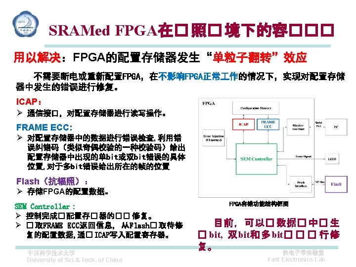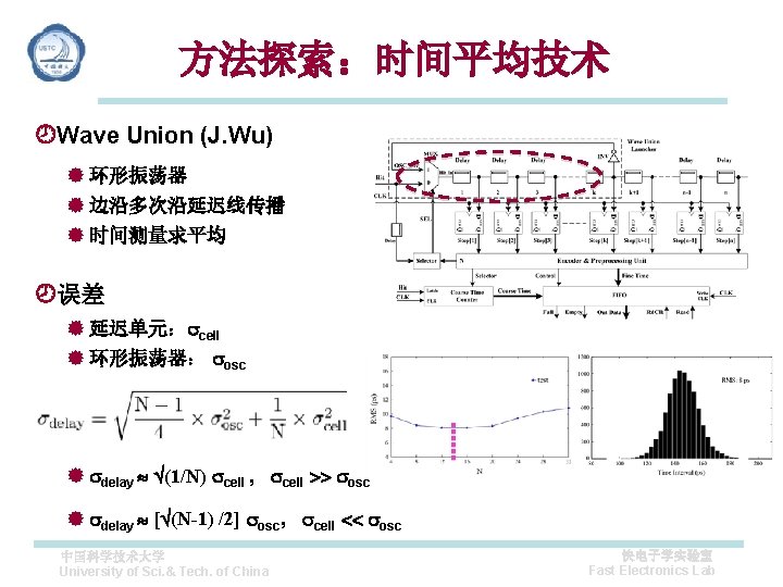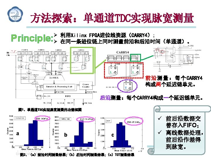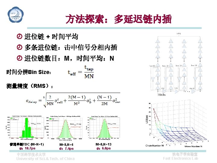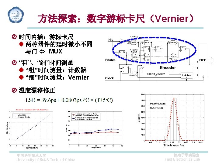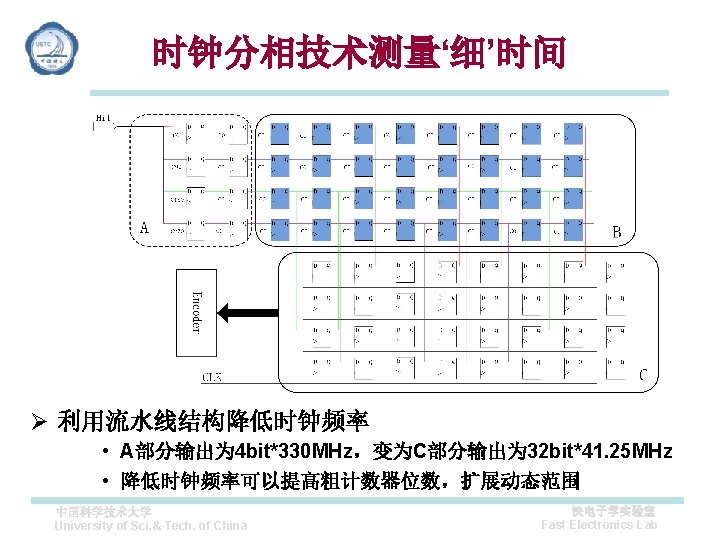 方法探索:快速胖树形编码 • Wave Union结构的延迟链TDC,连续多次测量,需要在 单周期内完成超宽位的非温度码到二进制码的快速编码。 Ø 2002,美国宾州州立大学D. Lee等 人在ASIC设计中提出了胖树形的编 码电路(Fat Tree Encoder)。 Ø改进其方法,在FPGA中成功实现。 “A fast improved fat tree encoder for wave union TDC in an FPGA”, Chinese Physics C, Vol. 37, No. 10, Oct. 2013, pp. 106102 -1 - 106102 -7. “A Stepped-Up Tree Encoder for the 10 -ps Wave Union TDC”, IEEE Transactions on Nuclear Science, Vol. 60, No. 5, Oct. 2013, pp. 3544 -3549. 中国科学技术大学 University of Sci. & Tech. of China 快电子学实验室 Fast Electronics Lab