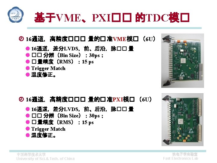 NIM标准的TDC插件 Ø Ø Ø Ø ~50 ps RMS, 100 ps Bin Size USB� 出 16 Channels, ~170 ms Dynamic range single-ended input, Range from -5 V~5 V, with on-board fast discriminator 中国科学技术大学 University of Sci. & Tech. of China 快电子学实验室 Fast Electronics Lab
