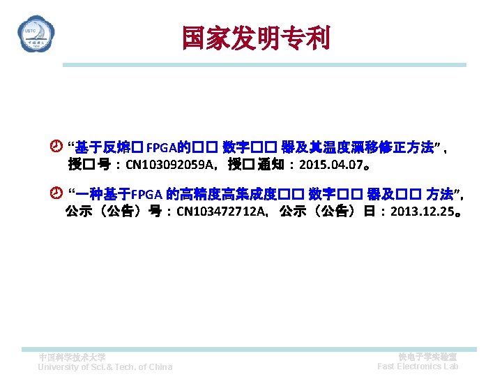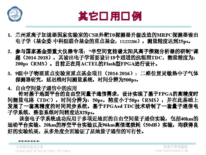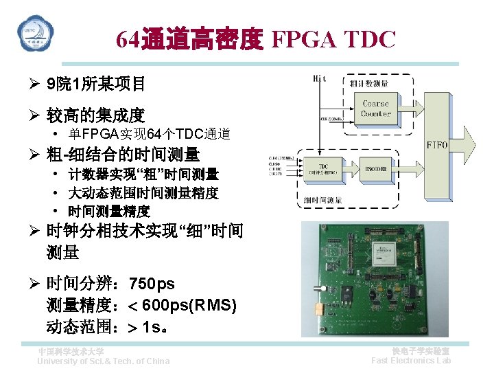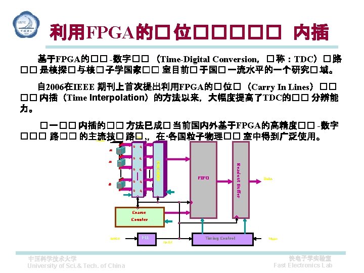 FPGAed TDC的研究进展 FPGAed TDC的应用 人才培养情况 论文与专利 中国科学技术大学 University of Sci. & Tech. of China 快电子学实验室 Fast Electronics Lab