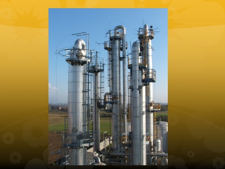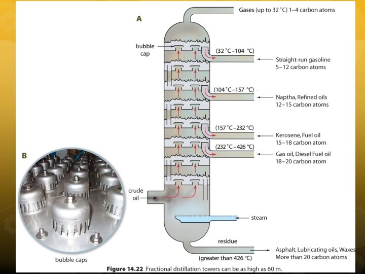 In distillation towers, petroleum is heated, vapourized, cooled, and condensed to separate the different fractions. The small chains have lower boiling points than longer chains. The temperature is higher near the bottom and cooler near the top of the tower.