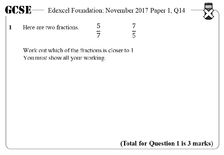 GCSE 1 Edexcel Foundation: November 2017 Paper 1, Q 14 Here are two fractions. Work out which of the fractions is closer to 1 You must show all your working. (Total for Question 1 is 3 marks)