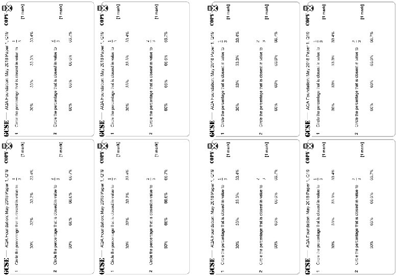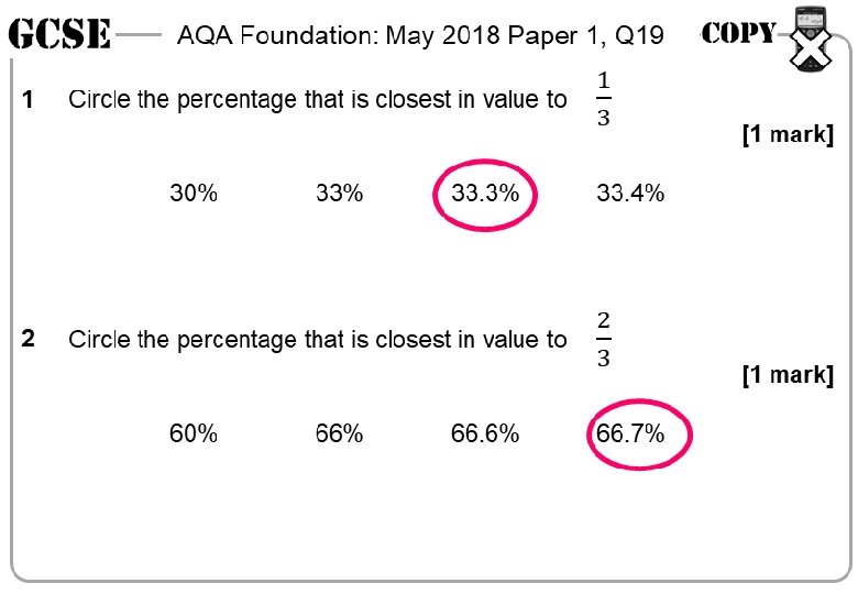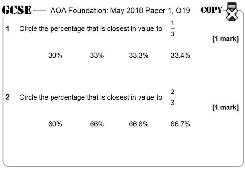 Fractions to Percentages – Foundation – GCSE Questions – AQA These questions are the same format as previous GCSE exams. COPY means they use the exact same numbers as the original GCSE question. Otherwise, they are clone questions using different numbers. The worksheets are provided in 2 sizes.
