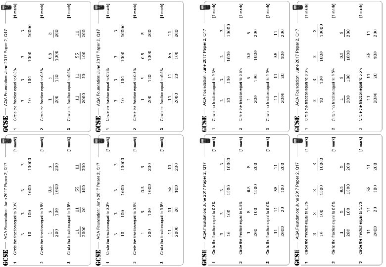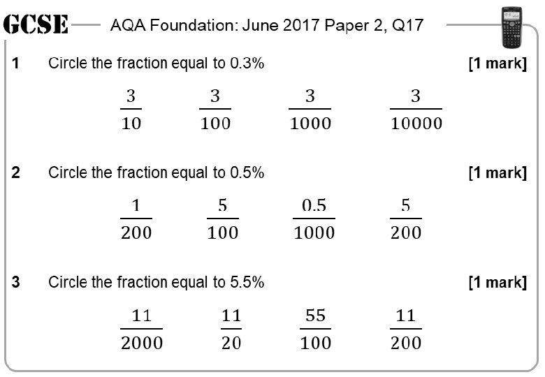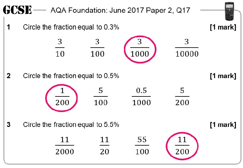 AQA Foundation: June 2017 Paper 2, Q 17 1 Circle the fraction equal to 0. 3% [1 mark] 2 Circle the fraction equal to 0. 5% [1 mark] 3 Circle the fraction equal to 5. 5% [1 mark]
