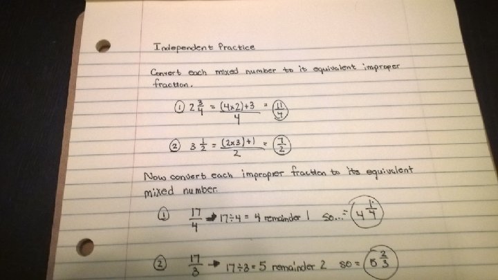 Convert Improper to Mixed Numbers Divide the denominator into the numerator Take how many times the denominator will go into the numerator and make that the whole number in front. Now make your remainder the NEW numerator keep your denominator the same.