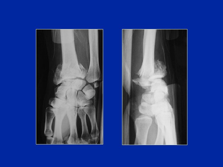 Fractura de Pouteau-Colles • • Caída sobre la palma de la mano Compresión + hiper-extensión Trazo situado a 2, 5 cm de la articulación radio-carpiana Adultos y ancianos