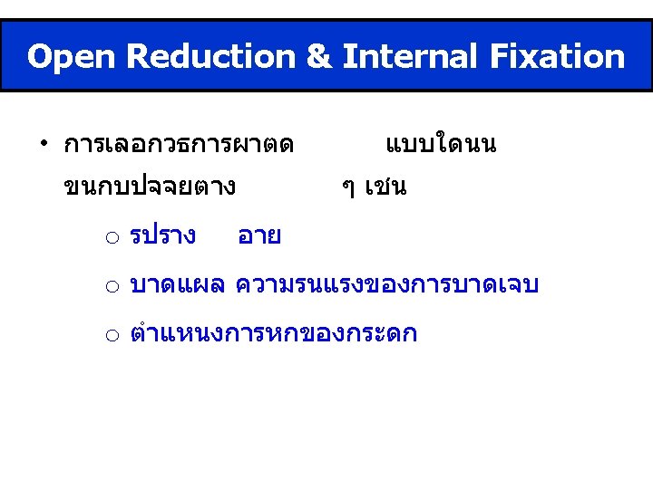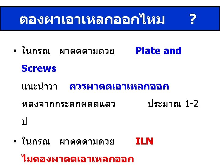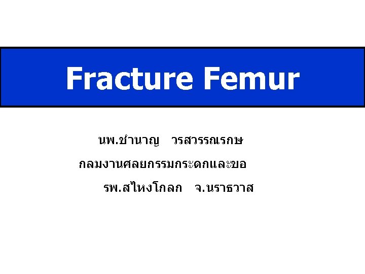 Take Home Message • Film >> ตองเหน Hip และ Knee ดวย • Skeletal traction : immobilization • Definite Rx : Surgery >> ORIF (P&S, Nail) • Post op : เดน NWB , ROM knee • P&S >> แนะนำผาตดเอาเหลกออก ป 1 -2
