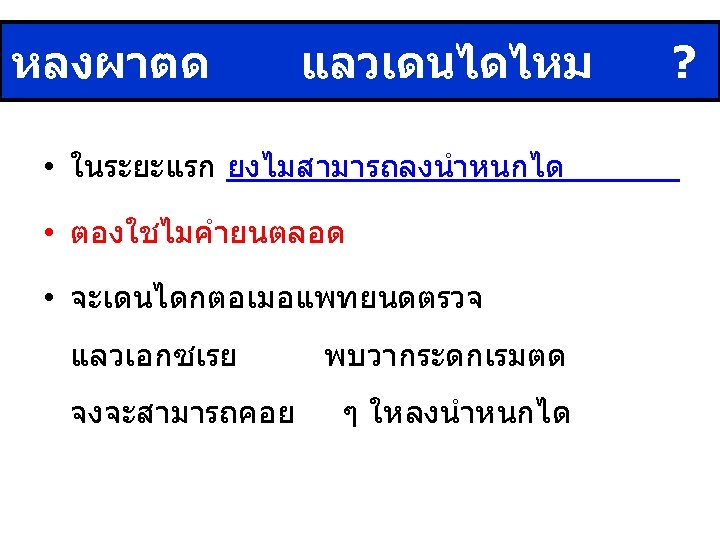 Post op management • Day 0 -1 : Pain management, Hct • Day 2 : off Foley’s cath, off radivac drain • Day 3 : สง PT หดเดน knee • Day 5 : D/C (NWB) , ROM