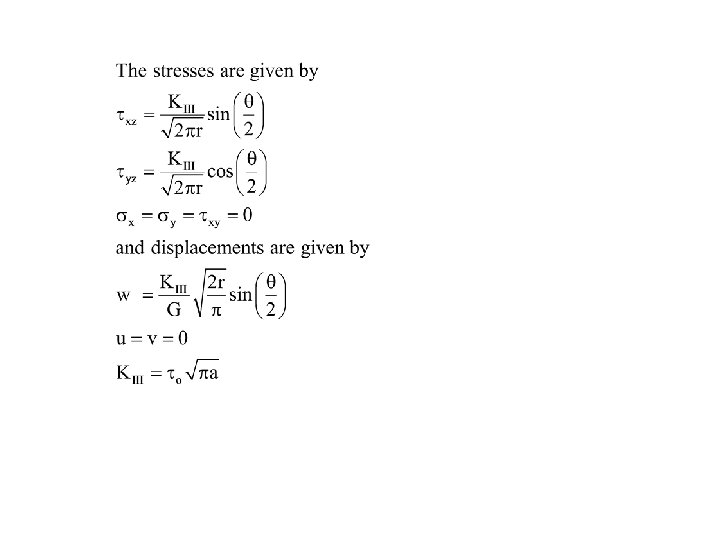 Boundary Conditions : • At infinity • On crack faces With usual simplification would give the stresses as Displacement components are given by
