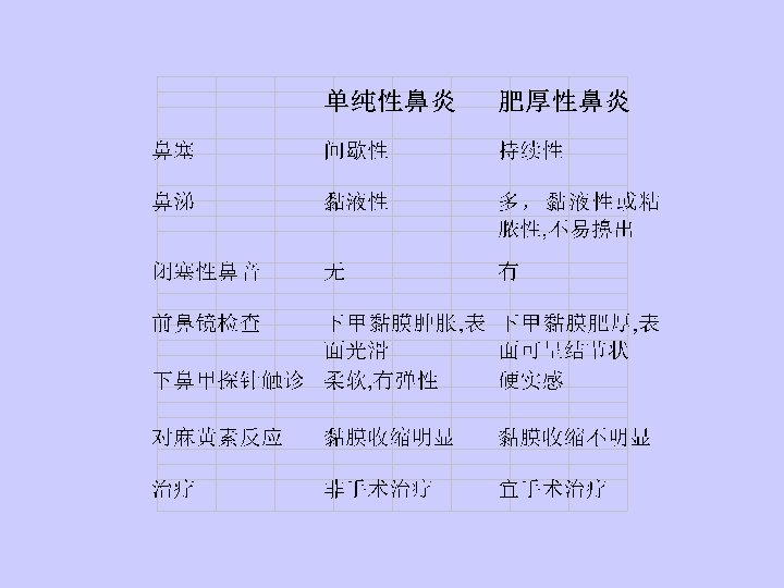 Symptoms & Sign: Nasal obstruction, rhinorrhea, hypertrophied inferior turbinate Treatment: 1、Pathogenic treatment 2、Local treatment