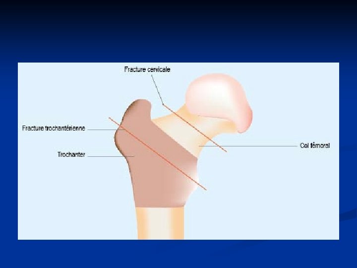 A/ fractures du col du fémur -DEFINITION : fracture située entre la région sous capitale et la base d’implantation du col. graves par leurs complications = pronostic fonctionnel chez l’adulte jeune (pseudarthrose et nécrose céphalique) vital chez le sujet âgé ( complications du décubitus ).