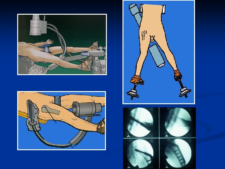 2 - FRACTURES TROCHANTERIENNES : BUT : ostéosynthèse solide = reprise fonctionnelle précoce = éviter les complications de décubitus. METHODES : a) a foyer ouvert : - lames plaques, clous plaques : peu solide , diffère l’appui jusqu’a consolidation , de moins en moins utilisées. - DHS : solide , autorisant l’appui. b) a foyer fermé : - enclouage d’ENDER : réduction sur TO puis plusieurs clou introduits dans le canal médullaire par le condyle fémoral interne et