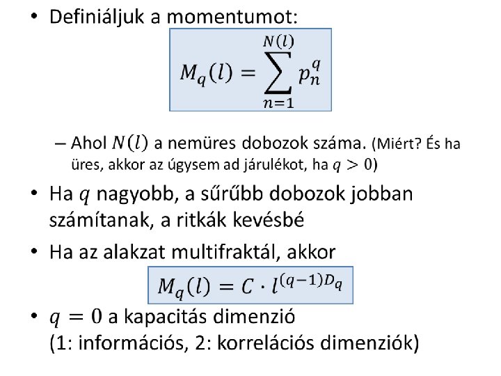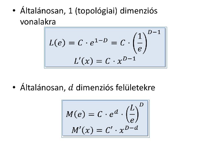 Hány dimenziós? • Topológiailag 0, mert nincs hossza • Mivel több, mint egy pont? Kapacitás dimenzió: Egyes szegmensek hossza (1/3, 1/9, …) Felbontás (3, 9, …)