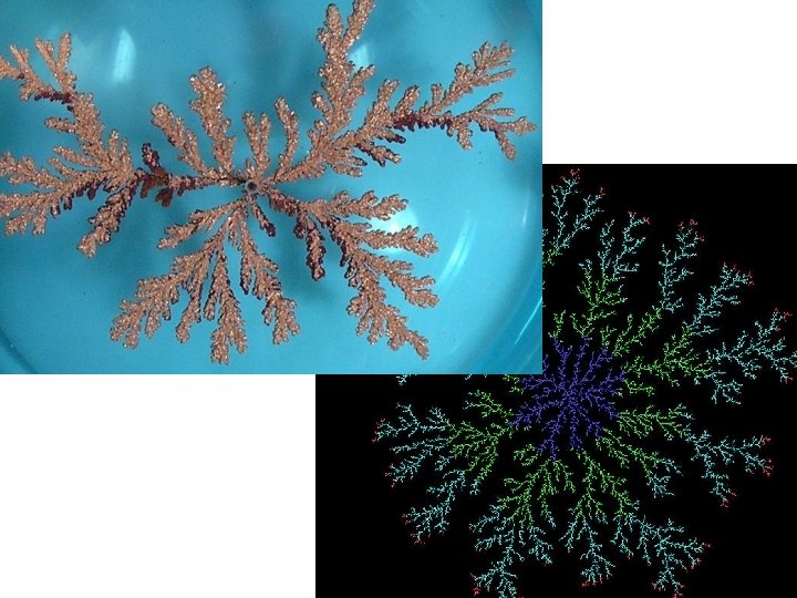 Szimulálni is lehet • Egyszerű szabály, rekurzív lépések • Diffúzió limitált növekedés: széles csoportja a fraktáloknak – https: //www. youtube. com/watch? v=e. AB 5 Zy. G 4 KWE • Mindig új és új részecskéket adunk a rendszerhez, amik kötődési valószínűsége függ a felület közelségétől • A külső részek leárnyékolják a belsőket, így a külsők jobban növekednek • Csúcsok fajlagos felülete nagyobb, ez jobban növekszik