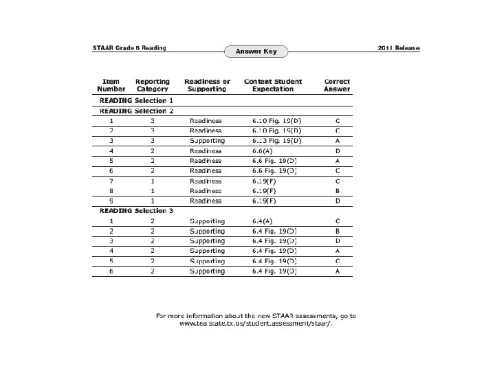In order for a 6 th grade student to be able to master this question, what do our teachers promise to teach? Let’s Look at Vertical Alignment 2011 English I Reading STAAR Released Item Grade 5 ~Question 1: 6. 10, Figure 19 D 6 th Grade Example Grade 6 Grade 7 (11) Reading/ Comprehension of Informational Text/ Expository Text. Students analyze, make inferences and draw conclusions about expository text and provide evidence from text to support their understanding. Tested SE (10) Reading/ Comprehension of Informational Text /Expository Text. Students analyze, make inferences and draw conclusions about expository text and provide evidence from text to support their understanding. (10) Reading/ Comprehension of Informational Text/Expository Text. Students analyze, make inferences and draw conclusions about expository text and provide evidence from text to support their understanding. Tested SE (Figure 19 D): make inferences about text and use textual evidence to support understanding; Readiness Standard (Expository) / Supporting Standard (Persuasive) Tested SE (Figure 19 D): make complex inferences about text and use textual evidence to support understanding; Readiness Standard (Expository) / Supporting Standard (Persuasive) Tested SE