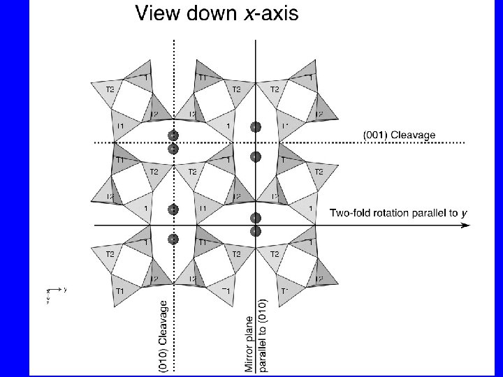 Structure of albite Na. Al. Si 3 O 8 Since Na is smaller than K, at lower temperatures the framework distorts to reduce the size of the cavity site. New symmetry is triclinic Point group 1 T 1 sites are split into T 1 o and T 1 m T 2 sites are split into T 2 o and T 2 m