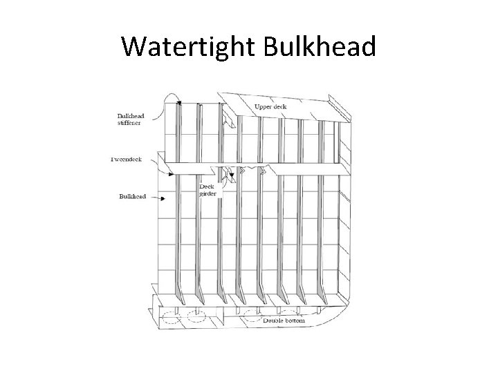 • The minimum number of water tight bulkhead depends upon the length of the ship and the location of its machinery space. All sea going merchant ships must have at least • Collision bulkhead placed at forward of the ship at 1/20 L (L is length of the ship) and it should be continuous to upper deck. (cont)