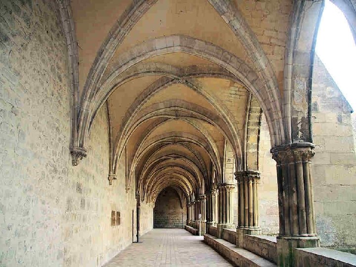 Une galerie du cloître. Contigu à la salle capitulaire, ce passage transversal, couvert de deux voûtes d’ogives, reliait le cloître aux jardins qui s’étendaient à l’est. Il permettait également aux moines d’accéder à la salle de travail, au sud du bâtiment.