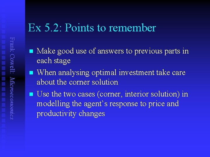 Ex 5. 2: Points to remember Frank Cowell: Microeconomics n n n Make good use of answers to previous parts in each stage When analysing optimal investment take care about the corner solution Use the two cases (corner, interior solution) in modelling the agent’s response to price and productivity changes