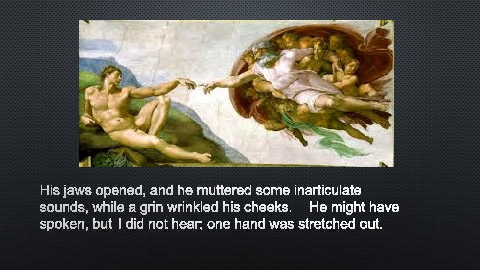“ BUT PARADISE LOST EXCITED DIFFERENT AND FAR DEEPER EMOTIONS. I READ IT, AS I HAD READ THE OTHER VOLUMES WHICH HAD FALLEN INTO MY HANDS, AS A TRUE HISTORY. IT MOVED EVERY FEELING OF WONDER AND AWE THAT THE PICTURE OF AN OMNIPOTENT GOD WARRING WITH HIS CREATURES WAS CAPABLE OF EXCITING. I OFTEN REFERRED THE SEVERAL SITUATIONS, AS THEIR SIMILARITY STRUCK ME, TO MY OWN. LIKE ADAM, I WAS APPARENTLY UNITED BY NO LINK TO ANY OTHER BEING IN EXISTENCE; BUT HIS STATE WAS FAR DIFFERENT FROM MINE IN EVERY OTHER RESPECT. HE HAD COME FORTH FROM THE HANDS OF GOD A PERFECT CREATURE, HAPPY AND PROSPEROUS, GUARDED BY THE ESPECIAL CARE OF HIS CREATOR; HE WAS ALLOWED TO CONVERSE WITH, AND ACQUIRE KNOWLEDGE FROM, BEINGS OF A SUPERIOR NATURE: BUT I WAS WRETCHED, HELPLESS, AND ALONE. MANY TIMES I CONSIDERED SATAN AS THE FITTER EMBLEM OF MY CONDITION; FOR OFTEN, LIKE HIM, WHEN I VIEWED THE BLISS OF MY PROTECTORS, THE BITTER GALL OF ENVY ROSE WITHIN ME. ” THE CREATURE IN CHAPTER 15 WE WILL EXAMINE HOW THE CREATURE’S EXPERIENCE DIFFERED FROMADAM’S AND DISCUSS THE PHILOSOPHICAL IMPLICATIONS.