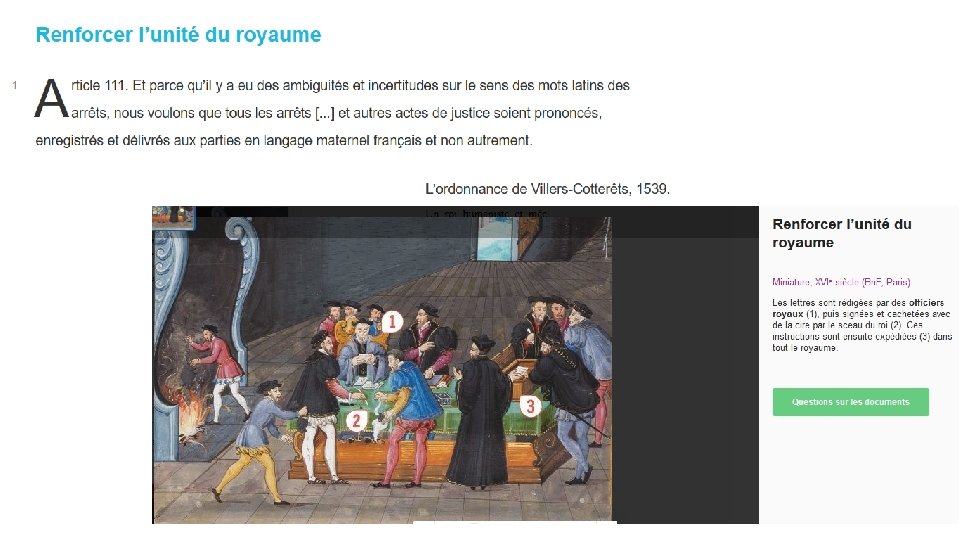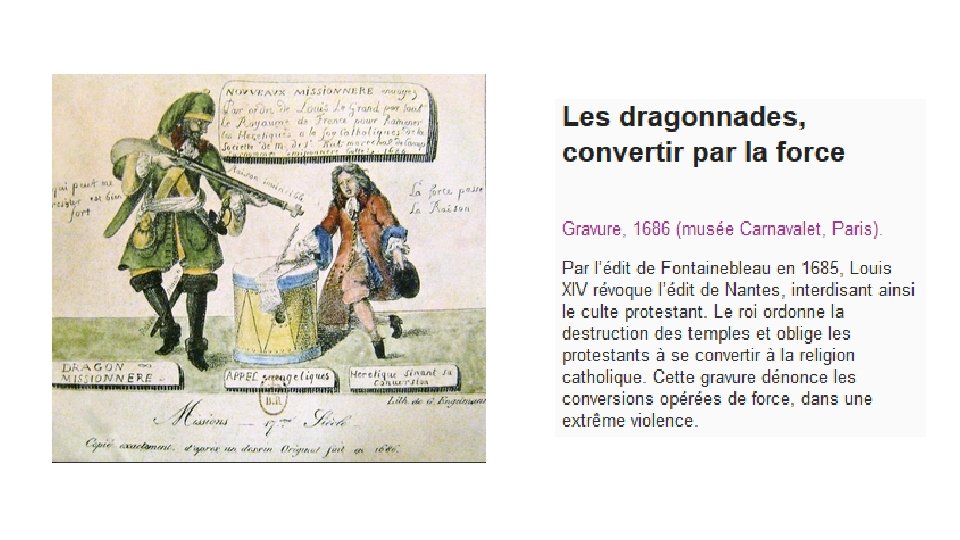 L’édit de Nantes (1598) À la fin des guerres de religion (voir p. 152 à 155), Henri IV promulgue l’édit de Nantes. Il rétablit la religion catholique comme religion du royaume, mais accorde des droits et des libertés aux protestants. Article 1. Défendons à tous nos sujets de se provoquer l’un l’autre sur ce qui s’est passé. Article 3. Ordonnons que la religion catholique soit rétablie en tous les lieux et endroits de notre royaume pour y être paisiblement et librement exercée. Article 6. Avons permis et permettons à ceux de la religion prétendue réformée 1 de vivre partout dans notre royaume sans être vexés, brutalisés, ni astreints à faire quelque chose contre leur conscience. Article 22. Ordonnons qu’il ne sera fait aucune différence entre les religions pour être admis dans les universités, collèges et écoles, dans les hôpitaux.