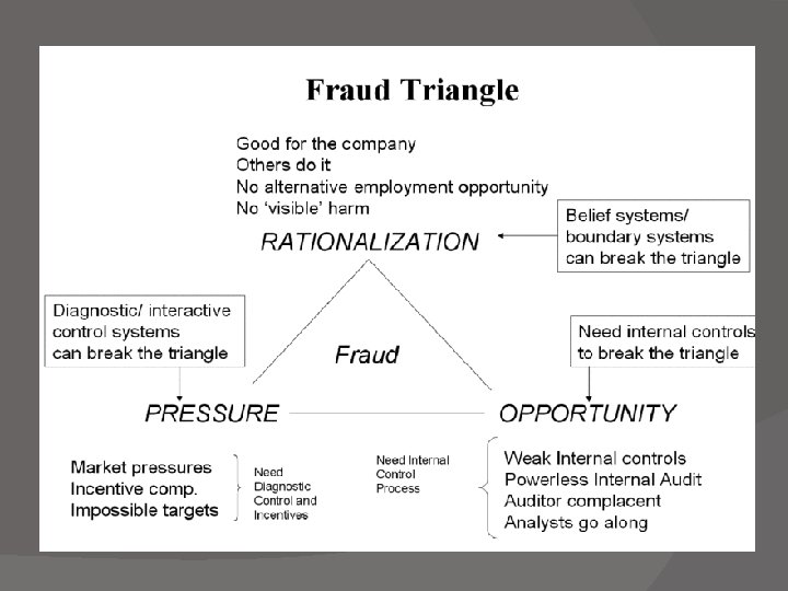 Faktor Pemicu Fraud � Penyebab atau faktor pemicu fraud menurut Fraud Triangle : Tekanan (Pressure) 2. Peluang / kesempatan (Opportunity) 3. Rasionalisasi 1.