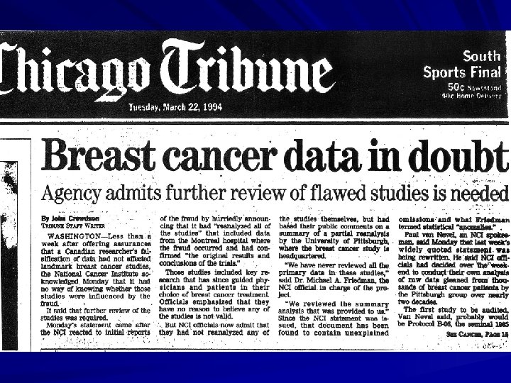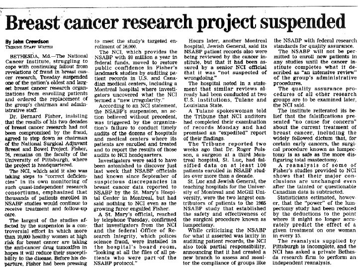 Dr. Roger Poisson Date: 1992 Place: St. Luc’s Hospital, Montreal Research: Multi-center clinical trial of lumpectomy vs. radical mastectomy in treatment of breast cancer, NSABP