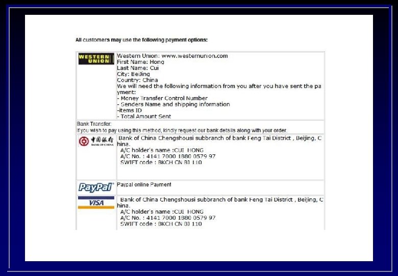 Stolen identity – Credit card + pin – Bank account + Utility Bill (fake) – Online trail l Phishing – Please enter your bank/card details. . – Fake banks