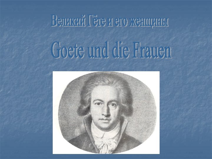 Frauen im Goetes Leben( Auswahl ) “Gretchen” (1763 -64 ) Kätchen Schönkopf ( 11766 -68 ) Susanne von Klettenberg ( 1772 ) Friederike Brion von Sesenheim (“Will kommen und Abschied”, “Mailied”, ”Heidenröslein”) Charlotte Buff (“Leiden des jungen Werther”) Lili Schönemann ( Verlobte; gelöst 1775 ) Charlotte von Stein ( Grosskochberg; “Ifigenia” Christiane Vulpius ( Ehefrau; 1765 -1816) Marianne von Willemer (1814 -15; ”West-östlicher Divan”) Ulrike von Levetzow(1823; Marienbad) Silvia von Ziegesar(seit 1776, 1808 Höhepunkt der Liebe, Jena-Drachendorf)