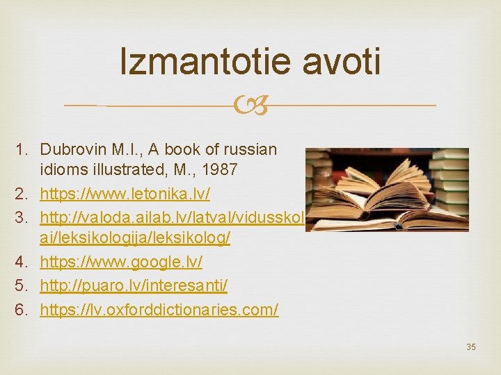 Izmantotie avoti 1. Dubrovin M. I. , A book of russian idioms illustrated, M. , 1987 2. https: //www. letonika. lv/ 3. http: //valoda. ailab. lv/latval/vidusskol ai/leksikologija/leksikolog/ 4. https: //www. google. lv/ 5. http: //puaro. lv/interesanti/ 6. https: //lv. oxforddictionaries. com/ 35