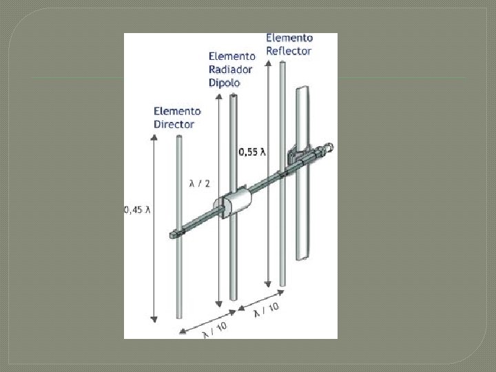 Antena tipo Yagi � � � Son usadas en FM como antenas receptoras o para radioenlaces, aunque la mayor parte de Yagis que vemos en los tejados son antenas para recibir los canales de TV. La particularidad de este tipo de antenas es que tienen varios elementos. Esto aporta dos ventajas: son muy directivas, ya que los elementos adicionales, llamados precisamente directores, tienen la misión de dirigir la señal hacia un solo lugar; la otra ventaja es su ganancia que aumenta con los elementos directores. En las antenas Yagi, a mayor número de elementos, mayor directividad y mayor ganancia. Pero la construcción de estas antenas respecto al tamaño y distancia de separación de cada elemento no es aleatoria como puedes ver en la imagen.