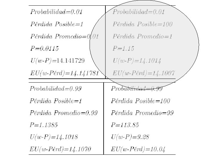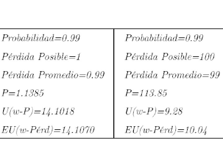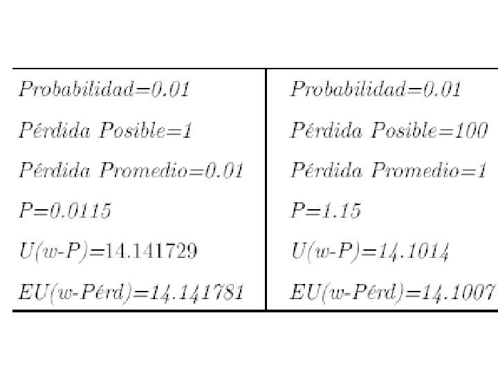 ¿Asegurables? • Tenemos un posible cliente con ingreso w = 200 y función de utilidad U (w) = √w. • Este individuo está sujeto a un riesgo de alta (baja) frecuencia (reflejada en la probabilidad de sufrir la pérdida) y alta (baja) severidad (reflejada en el monto de la pérdida) como se especifica en la tabla (laminas siguentes). • El asegurador calcula las primas (P ) como la pérdida promedio más un 15% adicional para cubrir las pérdidas no esperadas, los costos administrativos y de ventas, más un margen de utilidad. ¿En qué casos comprará el seguro?