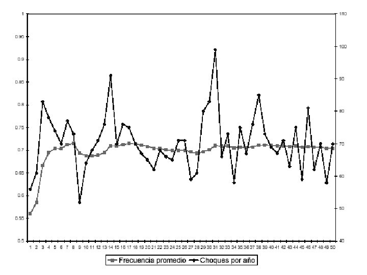 LGN no dice • Pero de ninguna manera LGN nos dice que, conforme más años transcurran, la frecuencia de choques convergerá a 71 choques por año. Una simulación de estas cantidades se muestra en la figura en las siguente lamina