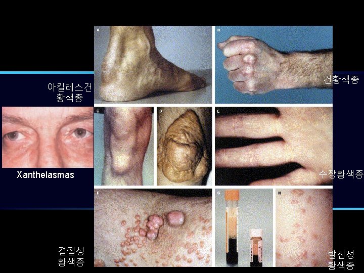고지혈증의 분류: Frederickson Classification of Hyperlipoproteinemia Phenotype I IIa IIb III IV V Lipoprotein CM LDL/VLDL CM/VLDL Triglyceride ++++ - ++ ++ to +++ ++ ++++ Cholesterol + to ++ ++ to +++ - to + ++ to ++++ Plasma Lactescent Clear Turbid Lactescent Xanthomas Eruptive Tendon, tuberous None Palmar, tuberoerupti ve None Eruptive CAOD - +++ +++ +/- Pancreatitis +++ 0 0 +++ Mol. Defects LPL, apo. CII LDL-R, Apo- Unknown B 100, PCSK 9, LDLRAP, ABCG 5/8 Apo. E Apo. A-V, GPIHBP 1 Diseases FH, FDBL FHTG FHTC FCS FCHL
