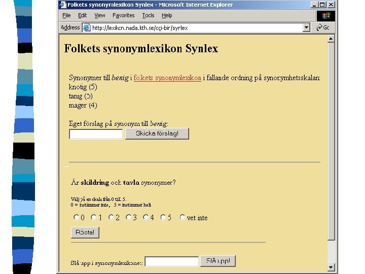 More ideas n Use the Lexin on-line Swedish-English dictionary web site, that had 9 millions (now 17 M) of lookups each month n Users visit Lexin to translate words, and are thus probably motivated to help me n Each time a user makes a lookup, give her the opportunity to decide whether two words are synonyms or not