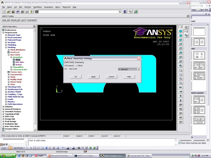 Free Meshing • Create the Geometry • Define Mesh Size >Preprocessor >Meshing>Size Controls>Smart Size>Basic