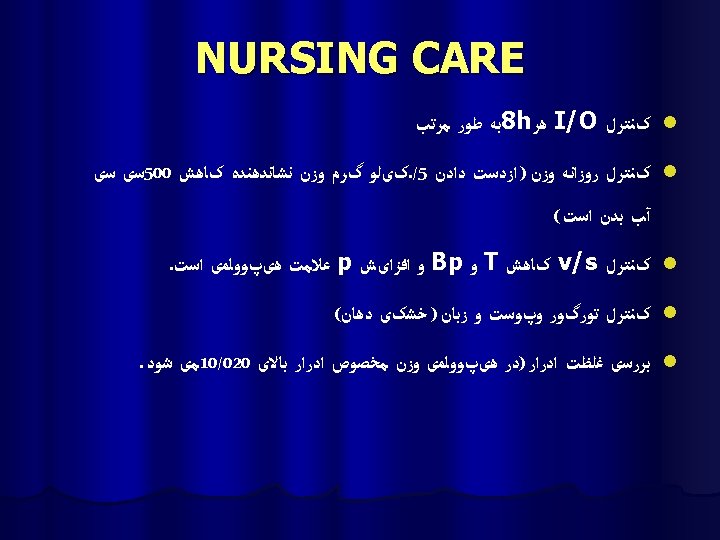 Nursing Care l Monitor I&O l Daily weight l Encouraging foods high in Na (normal requirement 500 mg) l Fluid restriction: 800 ml/day