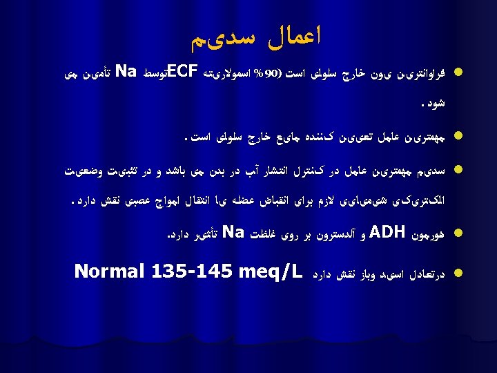 Sodium physiology ü Na is the most abundant positive ion of ECF compartment and is critical in determining the ECF and ICF osmolality. ü Normal amount 135 -145 meq/l