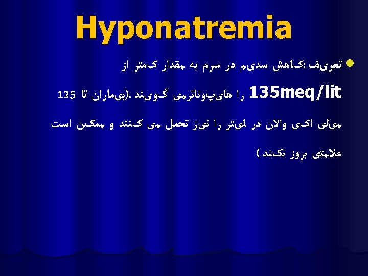 Treatment 1. Asymptomatic : increase the sodium level by no more than 0. 5 -1 meq/L/h to a maximum increase of 12 meq/L per day 2. Symptomatic: (Na<120 meq/L) Increase the sodium level by no more than 1 meq/L per hour until the serum Na level reaches 130 meq/L or neurologic symptoms are improved