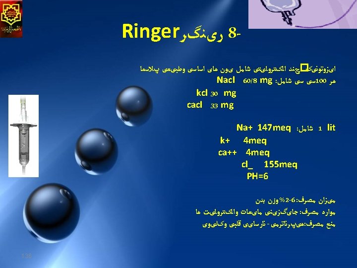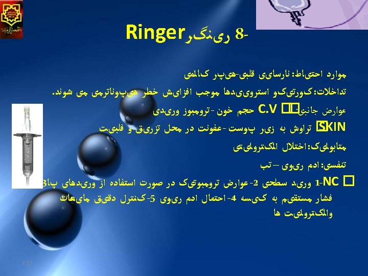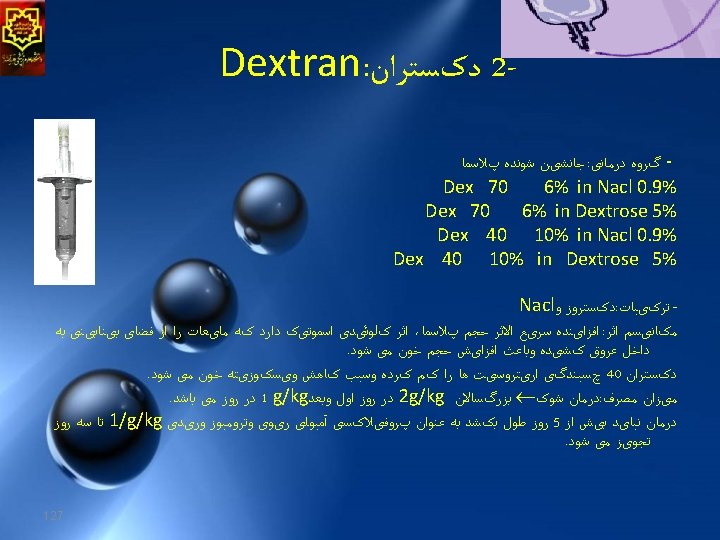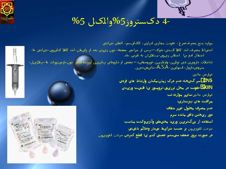 Crystalloid solution 1. The main solutions is either glucose or saline 2. Hypotonic or isotonic or hypertonic. 3. Safe , nontoxic, reaction free , inexpensive. 4. Complication is edema if large volumes are needed. 5. During surgery isotonic solution favored (normal saline - lactate ringer and plasma