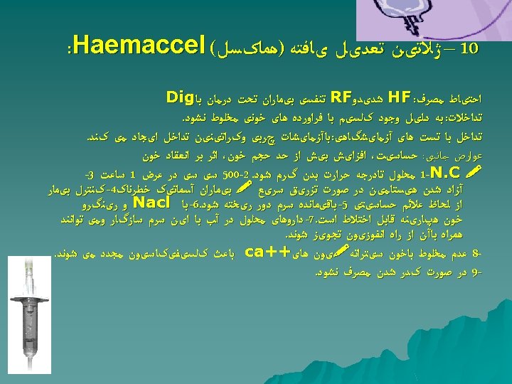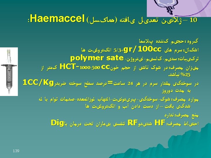 Colloid Solutions: • Contain high molecular weight substances do not readily migrate across capillary walls • Preparations - Albumin: 5%, 25% - Dextran - Gelifundol - Haes-steril 10%