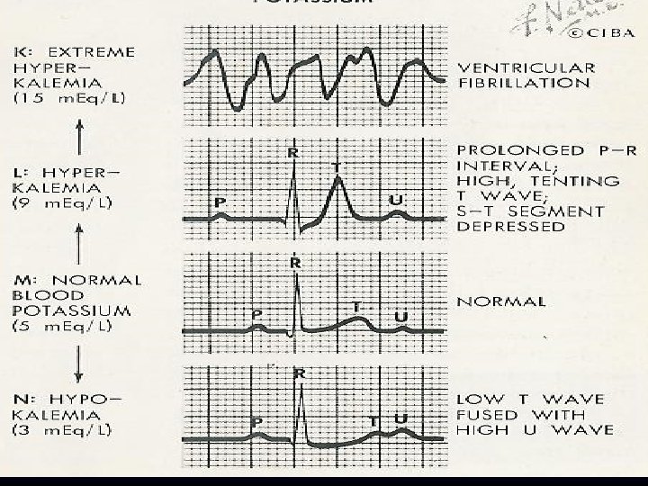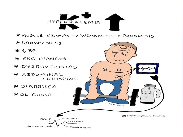 Clinical manifestation of hyperkalemia System hyperkalemia Gastrointestinal Neuromuscular Cardiovascular Nausea/vomiting , colic, diarrhea weakness, paralysis, respiratory failure Arrhythmia, arrest ECG changes Peaked T waves (early change) Flattened P wave Prolonged PR interval (first-degree block) Widened QRS complex Sine wave formation Ventricular fibrillation
